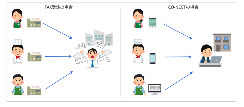 BtoB受発注システム「CO-NECT」は、FAXや電話といった従来のアナログな受発注業務を簡単にデジタルに置き換えられる受発注システムです。発注側はスマホやPCから数クリックで発注可能、受注側もインターネットが繋がる環境であればどこでも注⽂を受けることができます。